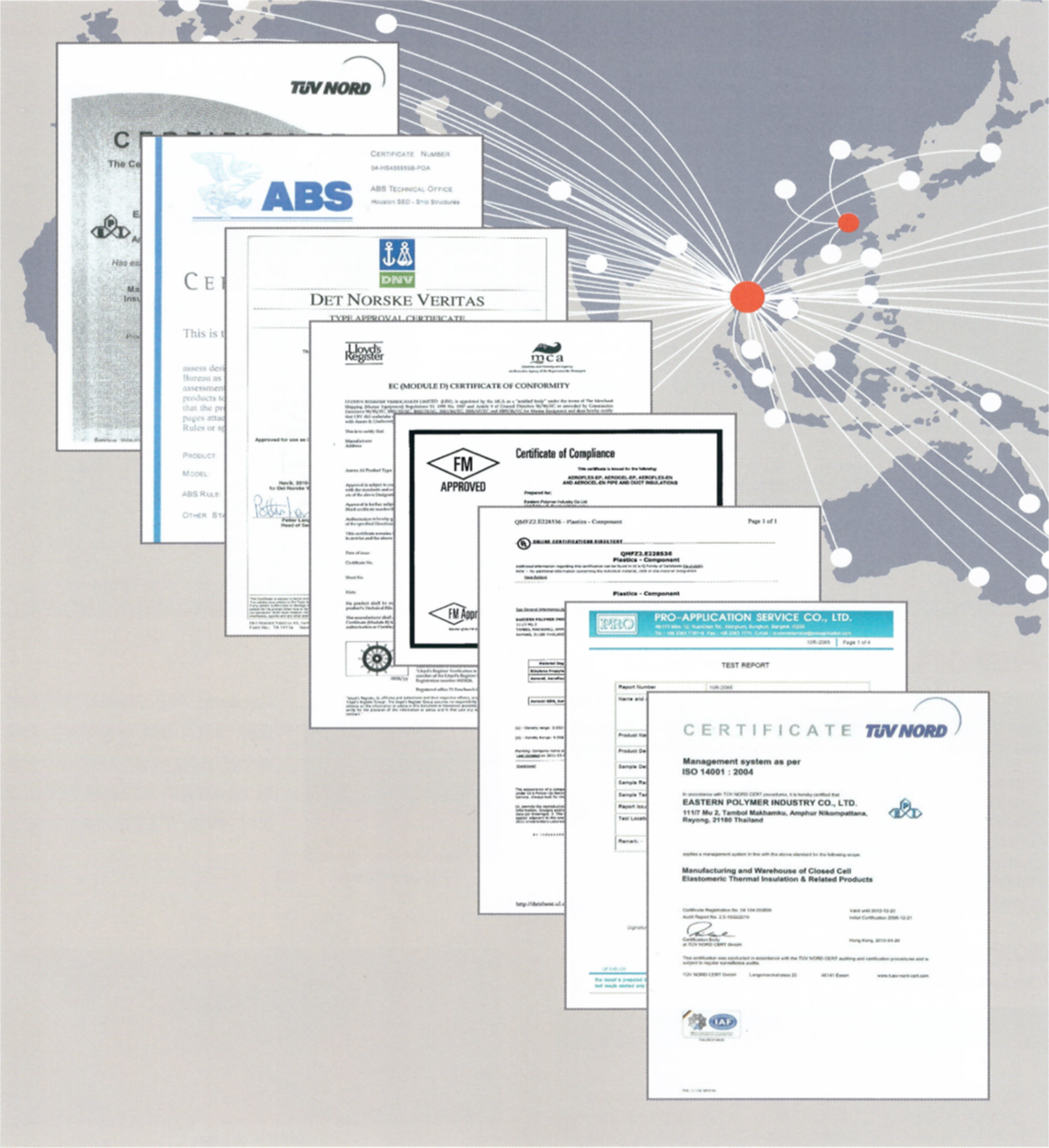 해당 분야 적용에 필수적인 품질인증인 IMO, ABS, DNV, Lloyd등을 보유한 품질시스템으로, 조선 선박 해양플랜트에서 요구되는 할로겐성분(Cl염소, Br브롬, I 요오드, F불소) Free인 EPDM고무발포의 제품으로는 전세계적으로 유일하게 EPDM 재료를 전문적으로 생산 공급하는 품질이다.